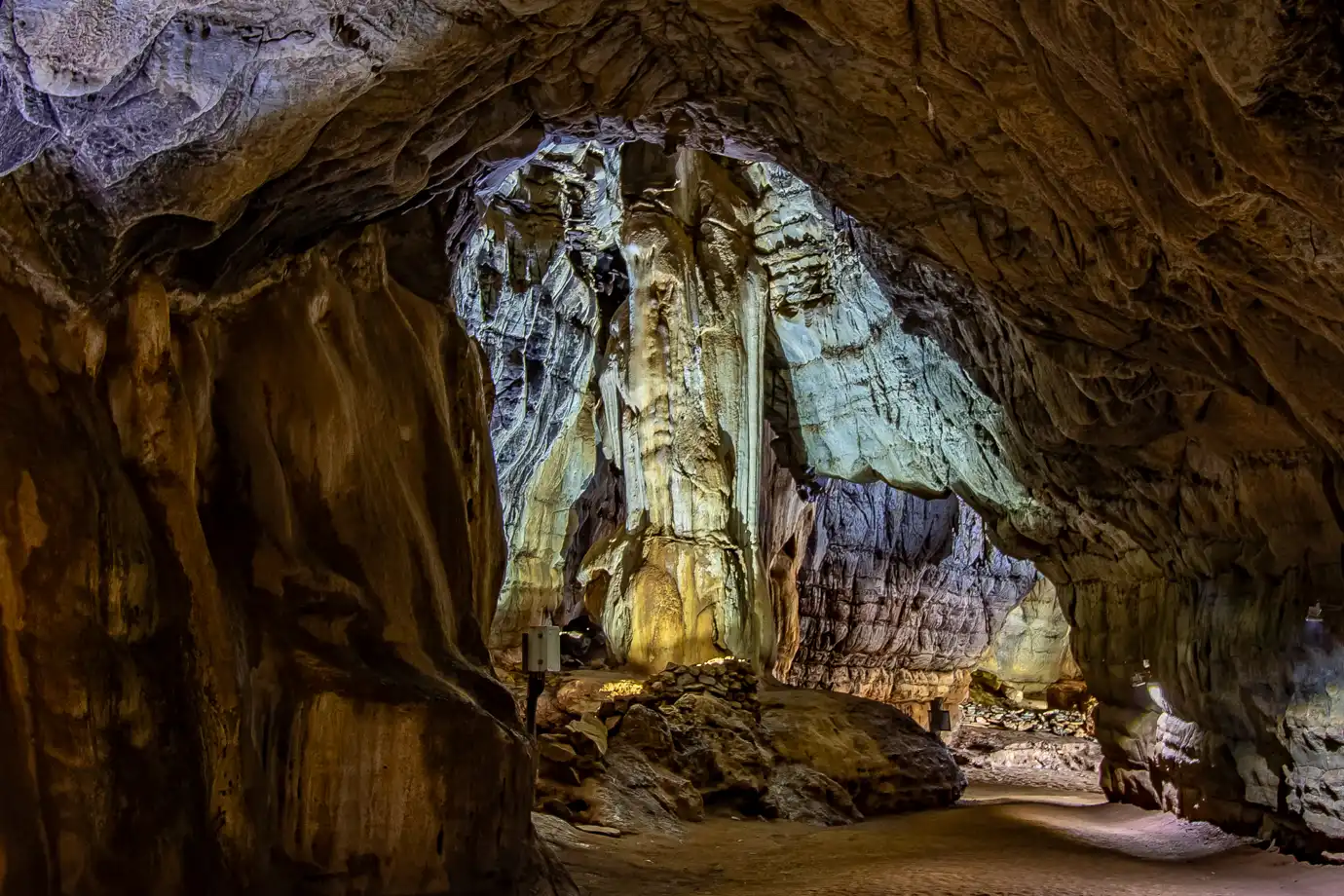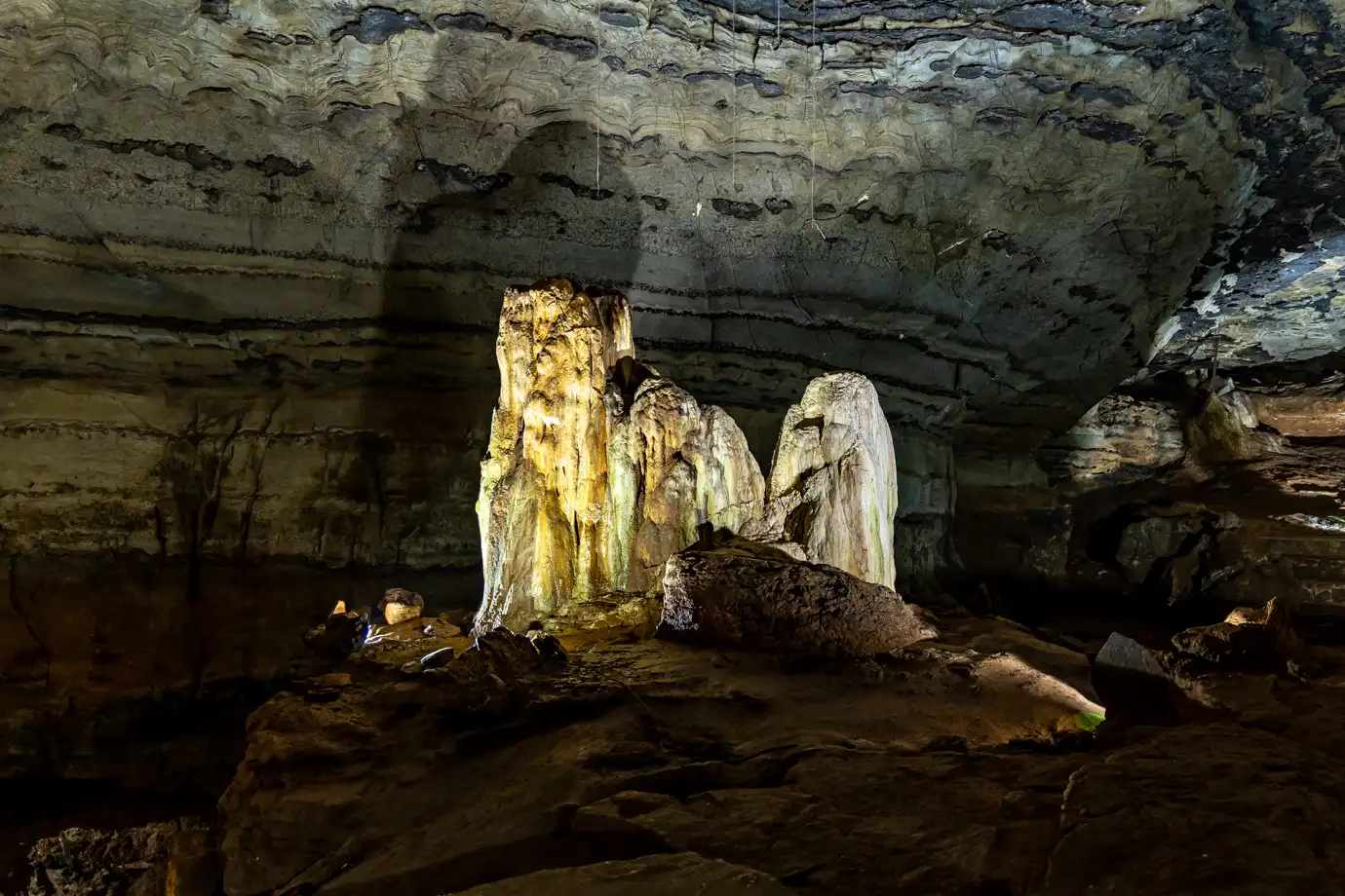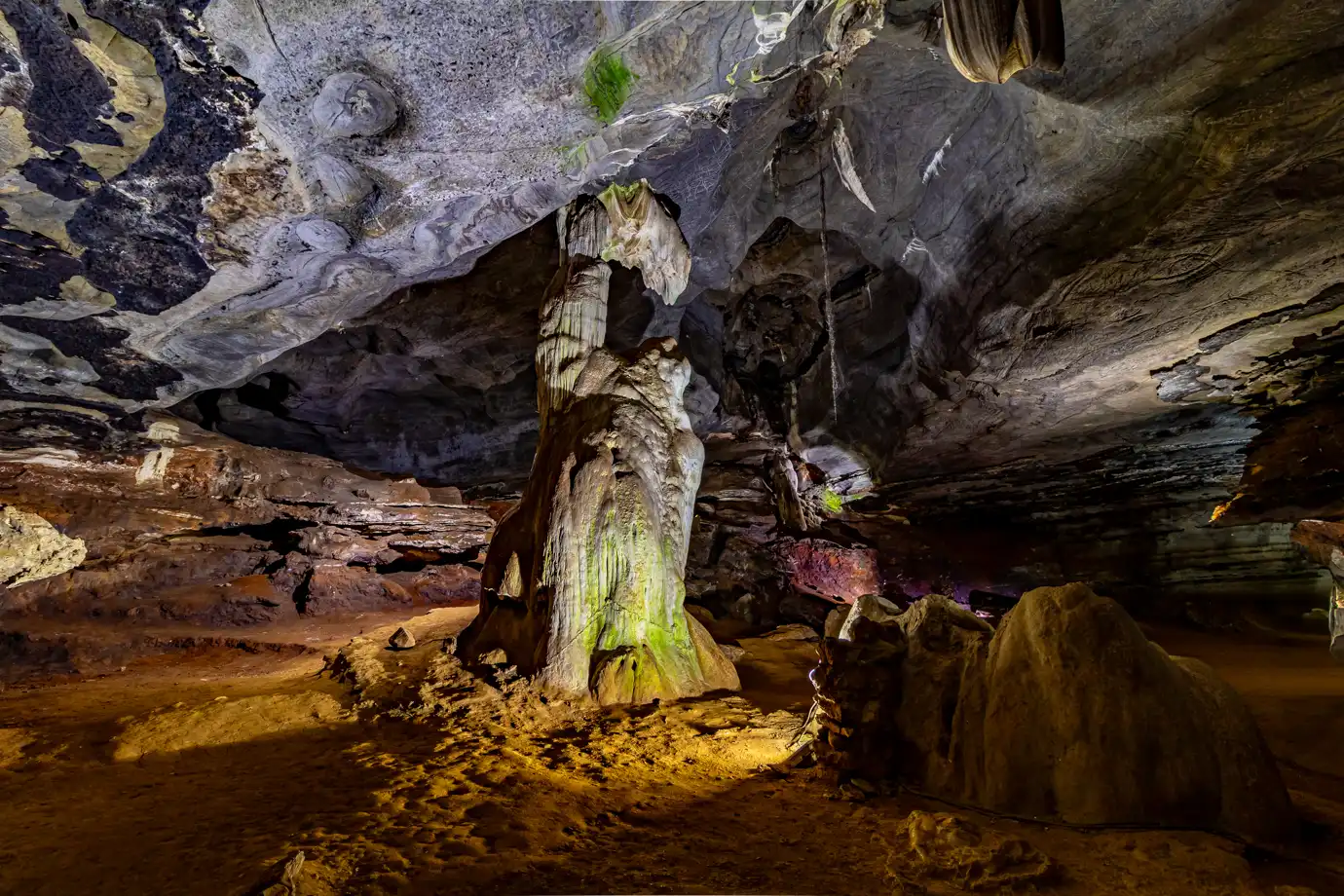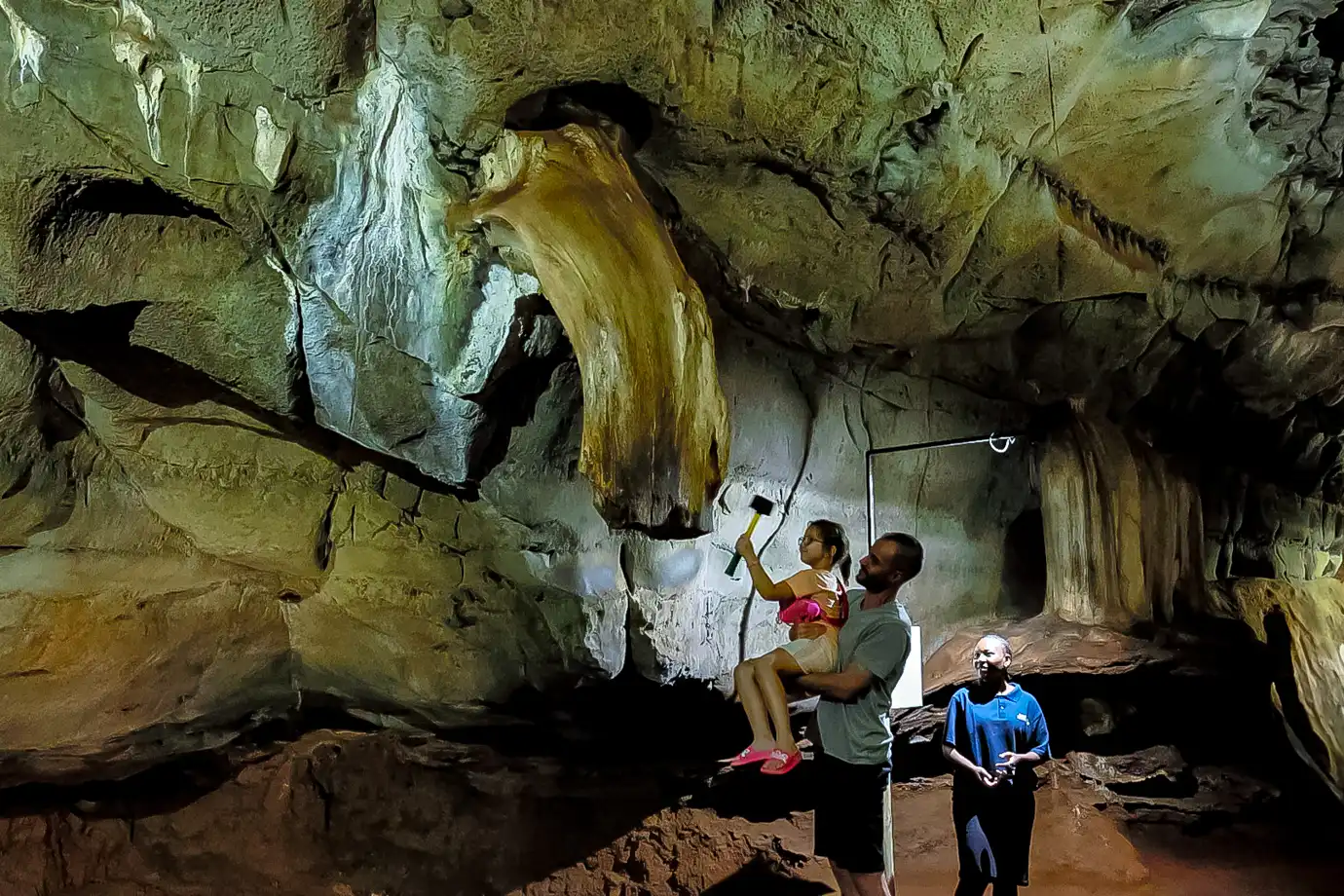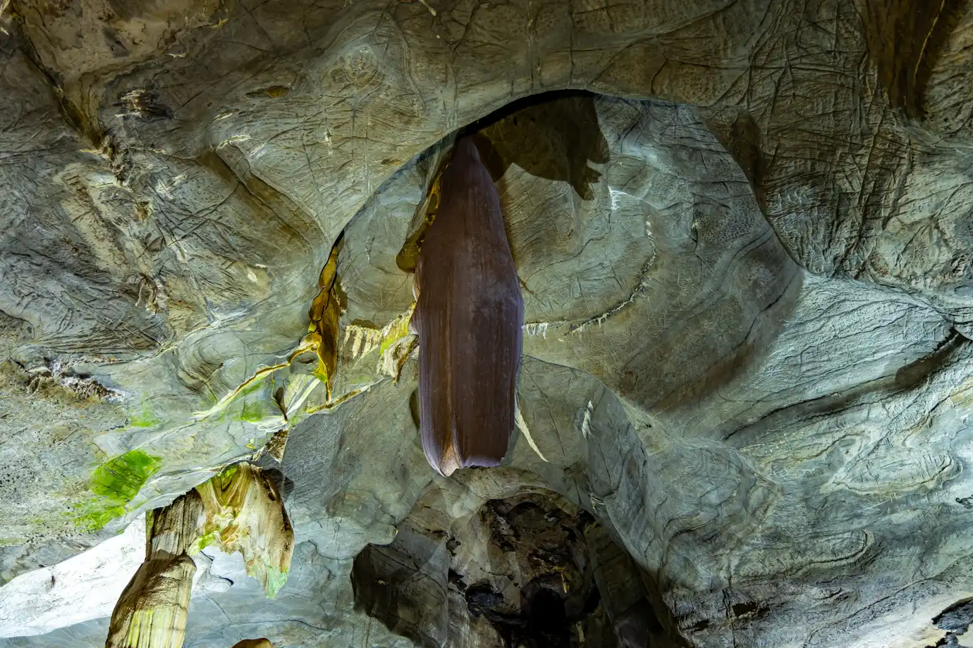 Standing for 185 million years, Samson’s Pillar is the oldest known stalagmite in the caves, a testament to the passage of time. Nearby, the Devil’s Chimney marks the origin of the cave system, where water first carved its way through the rock, beginning the formation process.
